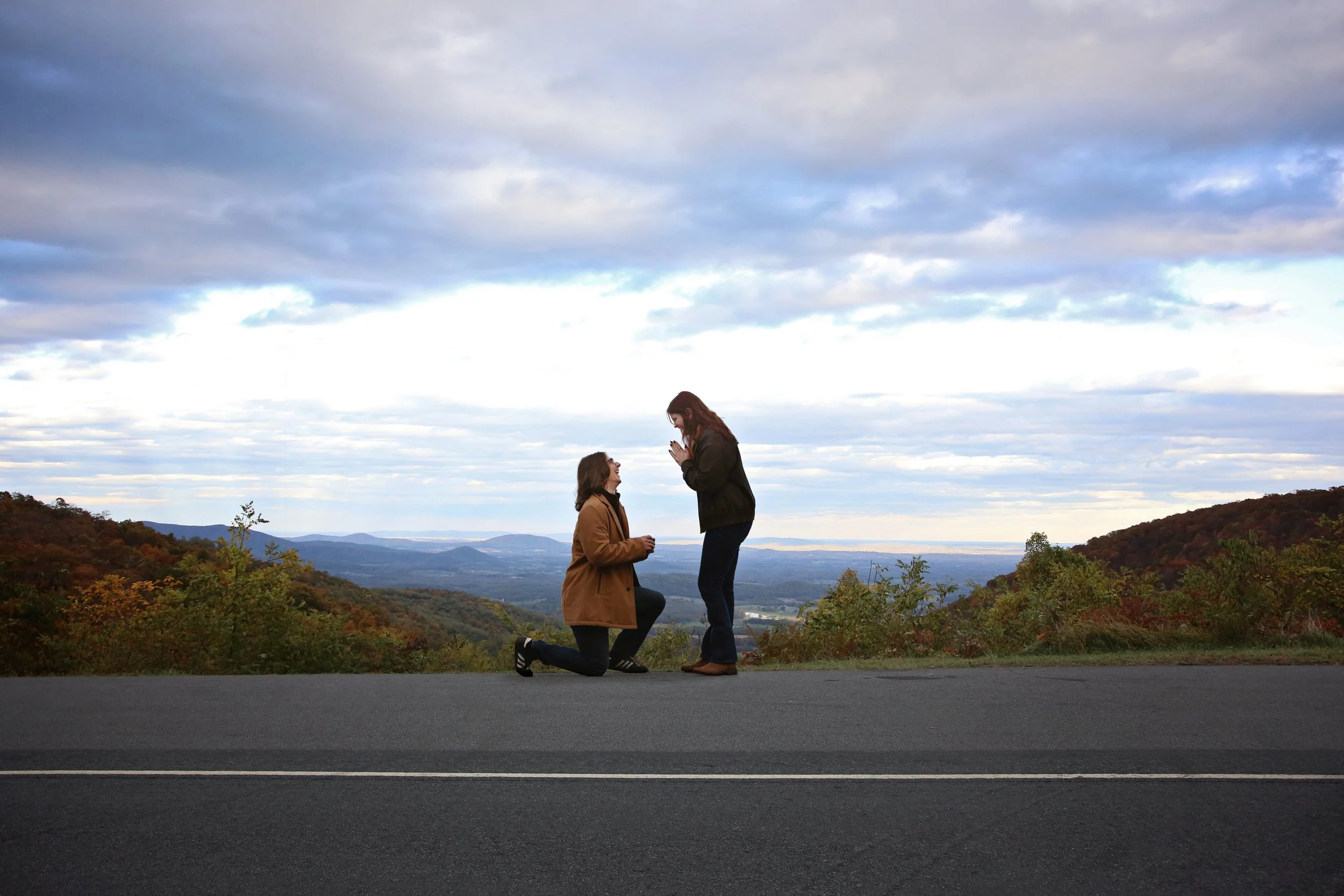 • A man kneeling on one knee proposes to a woman beside a lake in a park with the Washington Monument in the background.